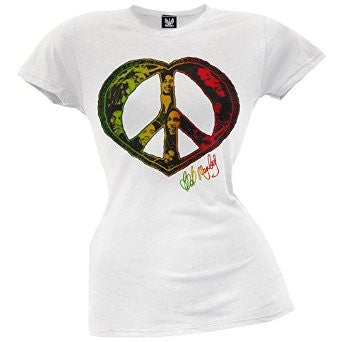 This white juniors t-shirt from Bob Marley features a gorgeous Rasta peace heart graphic printed on the front. Made from fitted, 100% cotton.