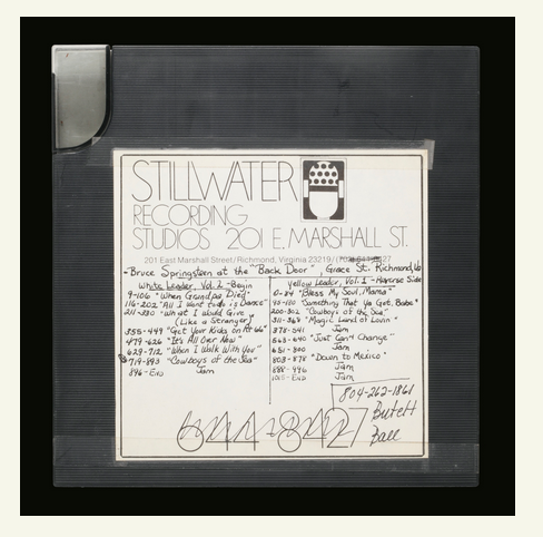 Vintage reel-to-reel recording of a thirteen song set performed during the Bruce Springsteen Band's month-long residency at the Back Door in Richmond, VA. (Jan/Feb, 1972). Printed label with hand-written setlist.