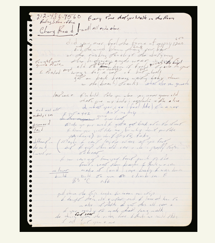 AUTOGRAPH MANUSCRIPT LYRICS FOR AN EARLY VERSION OF "THUNDER ROAD" 1 page (8 1/2 x 11 in; 216 x 280 mm) on a single sheet of ruled notepaper, [Long Branch & New York City, 1974-5], comprising 30 lines written in blue and black ink, being a draft of "Thunder Road" with superscript and marginal notations. Lyrics from unpublished “Love and Defiance,” on verso, 22 lines. In good condition.