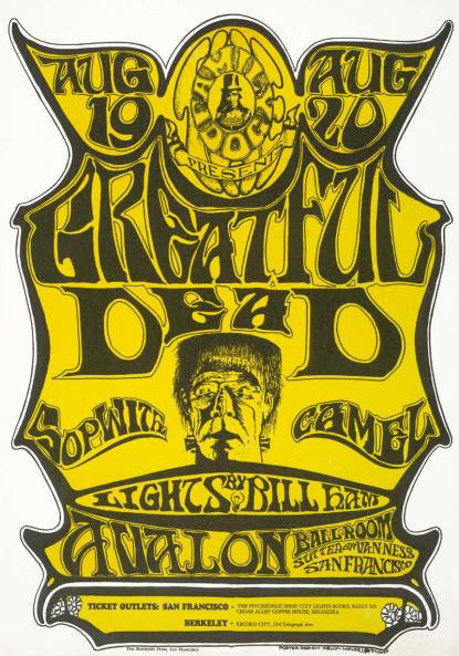 One of the most famous typos in rock poster history, the "Frankenstein" poster promotes the "Greatful Dead" concert at the Avalon Ballroom in August of 1966. This yellow and black classic was penned by Stanley Mouse and Alton Kelley as they experimented with symbols for the band.