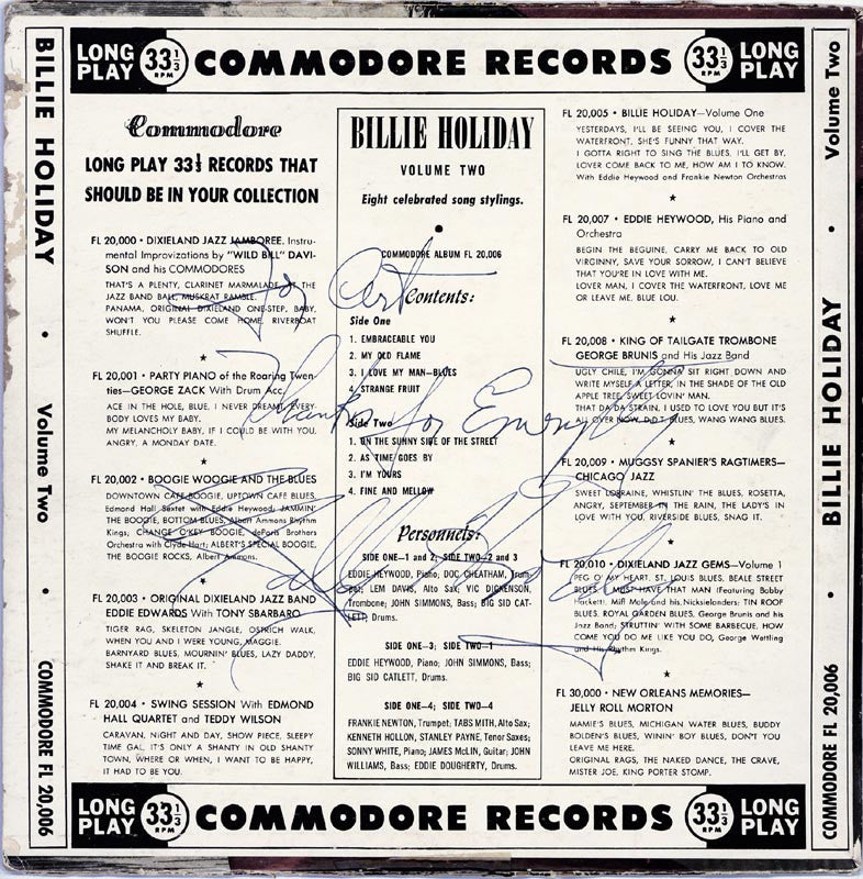 Album Cover inscribed and signed: "For Art/Thanks for Everything/Billy Holiday" on verso. Color cover, 10x10, featuring drawing of the legendary blues star by John DeVries. Her album, Billie Holiday, Vol. II, on Commodore Records. Record included (33 1/3 RPM). The eight songs on the album include "Embraceable You", "My Old Flame", "Strange Fruit", "On the Sunny Side of the Street" and "As Time Goes By".