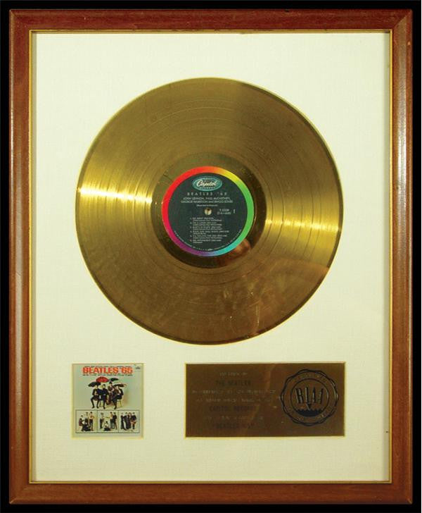 Gorgeous RIAA certified white matte gold record award for the December, 1964 release, "Beatles '65." "Presented to the Beatles to commemorate the sale of more than one million dollars worth" of the LP. All original except for rematting and frame. NRMT. 17.x21.5".