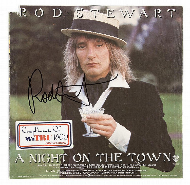A copy of Rod Stewart's A Night on the Town album, signed on the back cover in black marker "Rod Stewart." 12 1/2 by 12 1/2 inches