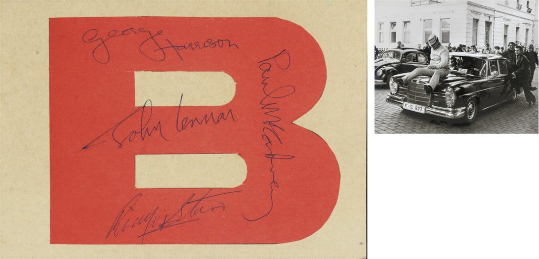 A cardboard sign embellished with a cut-out letter B in bright red, signed on the 'B' in blue ballpoint pen by George Harrison, John Lennon, Paul McCartney and Ringo Starr, overall measurements -- 8¼x5¾in. (21x14.5cm.); accompanied by a photograph of the B sign on the dashboard of the car in which the Beatles were chauffeured -- 8x10in. (20.3x25.4cm.) (2)